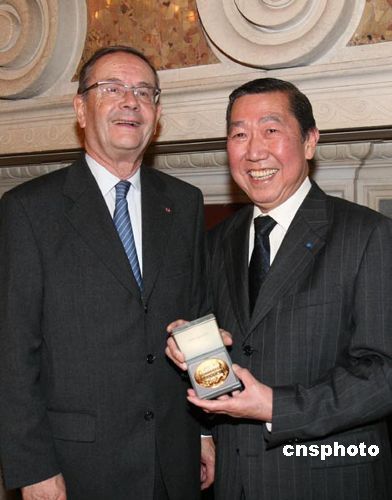 當?shù)貢r間1月7日,法國納伊市市長巴依向旅法僑界知名華裔人士何福基(右)頒授榮譽獎章,以表彰他為促進法中友好與合作及亞裔融入法國社會做出的積極貢獻。與法國總統(tǒng)薩科奇相識三十多年的何;,是該市的一位知名人士,2007年底薩科奇首次訪華時,何;鳛榇韴F中唯一的華裔人士隨同訪問。中新社發(fā) 鐘誠 攝