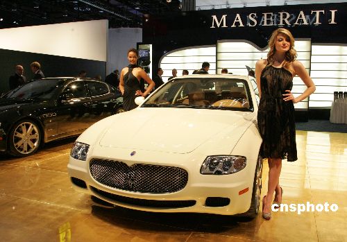 底特律當(dāng)?shù)貢r(shí)間一月十三日,在2008年北美國(guó)際汽車展上,瑪莎拉蒂豪華房車與時(shí)尚美女華麗現(xiàn)身。中新社發(fā) 潘索菲 攝