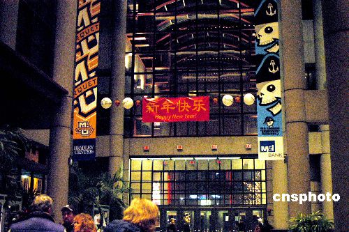 當?shù)貢r間二月二日,姚明率領的休斯敦火箭隊作客密爾沃基布拉德利球館,客場以九十一比八十三險勝另一名中國球員易建聯(lián)所在的雄鹿隊,獲得三連勝。為了迎接這場“姚易大戰(zhàn)”,布拉德利中心看上去更像是一個“廟會”,到處可見“新年快樂”的漢語條幅。中新社發(fā) 李靜 攝