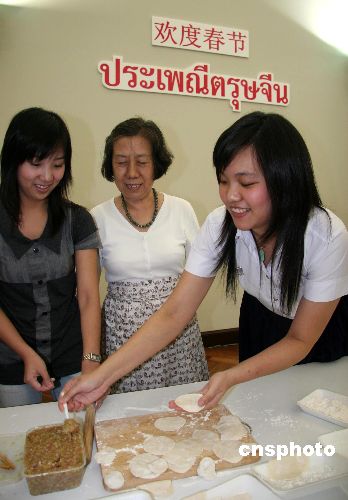 圖為朱拉隆功大學(xué)孔子學(xué)院中方院長(zhǎng)、北京大學(xué)教授傅增有(左),在教泰國(guó)學(xué)生包餃子。