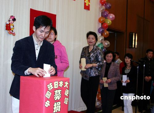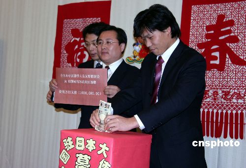 2月4日晚,中國(guó)駐日大使館舉行2008年春節(jié)聯(lián)歡會(huì)前,專門(mén)舉行了向國(guó)內(nèi)雨雪災(zāi)區(qū)進(jìn)行捐款的活動(dòng)。中新社發(fā) 滕劍峰 攝