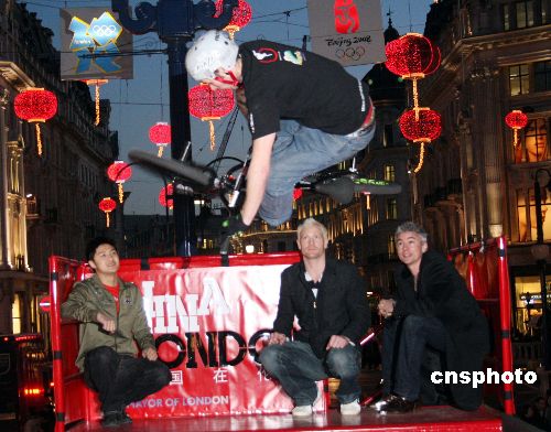 當(dāng)?shù)貢r(shí)間6日晚,田亮和兩名英國(guó)前世界冠軍——三級(jí)跳遠(yuǎn)選手喬納森·愛(ài)德華茲和四百米運(yùn)動(dòng)員伊萬(wàn)·托馬斯共同在倫敦市中心啟動(dòng)了高懸在牛津街上的大紅燈籠,“中國(guó)在倫敦二00八”系列中國(guó)新年慶祝就此開(kāi)幕,圖為田亮(左一)、愛(ài)德華茲(右一)和托馬斯(中)在觀看小輪車(chē)選手的高空特技表演。中新社發(fā) 李鵬 攝