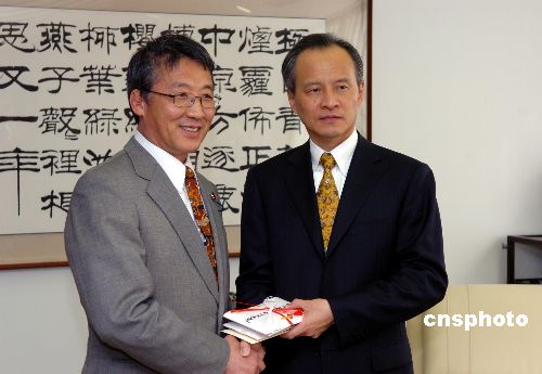 2月7日,日本執(zhí)政黨之一的自民黨國際局長三原朝彥(左)來到中國駐日使館,代表該黨向中國雨雪災(zāi)區(qū)捐款。中國駐日大使崔天凱作為中國政府代表接受此項捐款。中新社發(fā) 滕劍峰 攝