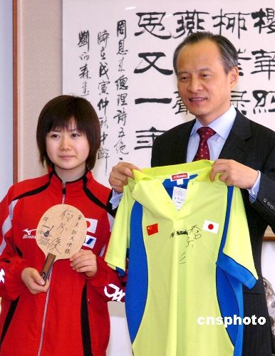 圖:日本乒乓球運(yùn)動(dòng)員福原愛(ài)向崔天凱大使贈(zèng)送球衣