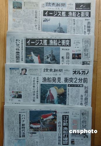 針對2月19日發(fā)生的日本宙斯盾軍艦撞沉漁船的事故,日本各大媒體連日來均在頭版頭條位置或者新聞節(jié)目的頭條時間突出報道,圖為19日至21日的合計發(fā)行量近2000萬份的《讀賣新聞》和《朝日新聞》的頭版頭條報道。據(jù)報道,撞擊事件在日本政界引發(fā)了軒然大波,在野黨紛紛質(zhì)疑擁有“世界上最先進(jìn)的雷達(dá)系統(tǒng)”的軍艦為何突然不靈了,而首相福田則可能因此再次遭受新的打擊。中新社發(fā) 段躍中 攝