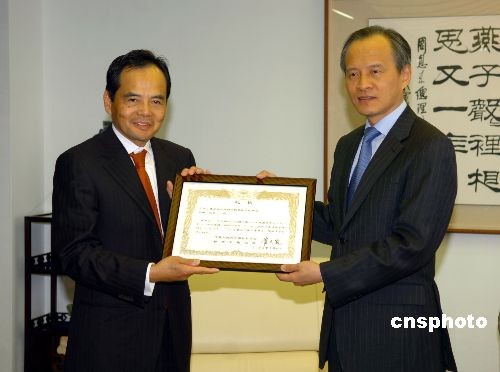 3月6日下午,日本零售業(yè)巨頭之一永旺集團(tuán)董事長(zhǎng)兼總經(jīng)理岡田元也來到中國(guó)駐日大使館,委托使館向中國(guó)臥龍熊貓基地捐款2500萬日元。圖為接受捐款后,中國(guó)駐日大使崔天凱(右)向?qū)镌?左)頒發(fā)獎(jiǎng)狀。中新社發(fā) 滕劍峰 攝