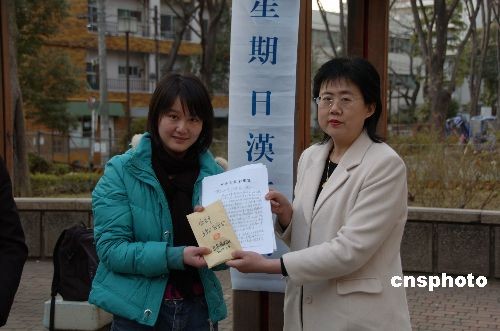 3月9日,日本東京漢語角舉行的第30次交流會上,日本僑報社社長張景子(右)代表中日兩國的捐款者,把全部捐款和寫給湖南省長周強的信,轉(zhuǎn)交給了正在日本訪問的湖南省人民對外友好協(xié)會干部曾卓然(左),表達(dá)大家對湖南災(zāi)區(qū)人民的關(guān)切之情。近一個月來,日本僑報社組織的為湖南災(zāi)區(qū)人民捐款活動,共收到4個團(tuán)體、53位日本友人和在日華人的全部捐款38.2885萬日元。中新社發(fā) 段躍中 攝