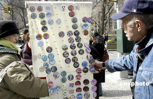 3月22日,紐約街頭一名反戰(zhàn)女士(左)自制各種反戰(zhàn)及總統(tǒng)大選的徽章在街頭售賣,吸引不少路人選購。她稱很多美國民眾和她一樣已經(jīng)厭倦了布什政府發(fā)動的這場勞命傷財?shù)膽?zhàn)爭。 中新社發(fā) 鄧悅 攝