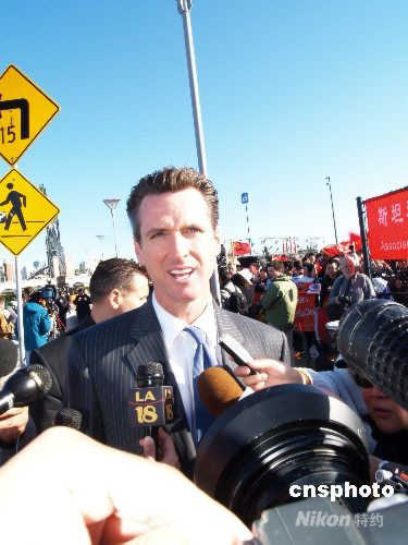 圖:舊金山市長(zhǎng)紐森被媒體“包圍”