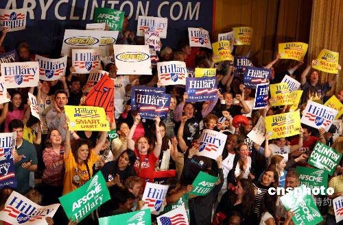 前美國第一夫人希拉里4月22日在賓夕法尼亞州贏得民主黨總統(tǒng)侯選人提名戰(zhàn)的一場關(guān)鍵性勝利。圖為希拉里的支持者在費(fèi)城舉行的慶功會上歡呼慶祝。中新社發(fā) 李靜 攝