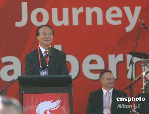 4月24日中午11時35分,北京奧運(yùn)圣火在澳大利亞首都堪培拉的傳遞順利結(jié)束。北京奧運(yùn)圣火在堪培拉的傳遞從和解廣場開始后,途經(jīng)戰(zhàn)爭紀(jì)念館、高等法院、國家圖書館、國會大廈等地,最終于中午12時左右在聯(lián)邦公園點(diǎn)燃圣火盆并舉行慶典儀式?芭嗬瓊鬟f路線全長約15公里,80位火炬手,平均每人傳遞190米左右。圖為北京奧組委執(zhí)行副主席蔣效愚(左)在慶典儀式上致辭。