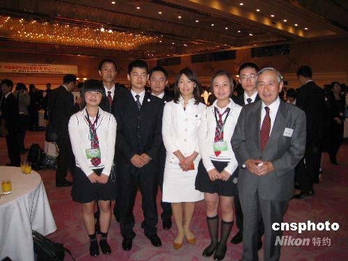 5月14日晚,由日本財團(tuán)法人日中友好會館、社團(tuán)法人日中友好協(xié)會主辦的歡迎中國高中生400人訪問團(tuán)酒會在東京舉行。作為2008年“二十一世紀(jì)東亞青少年大交流計劃”的第二批,他們將參加與日中關(guān)系相關(guān)的研討會,走進(jìn)日本高中課堂,在日本高中學(xué)生家庭住宿外,還將進(jìn)行文化、經(jīng)濟(jì)、社會等方面的考察。圖為出席酒會的四川高中生和日中友好會館谷野作太郎副會長合影。中新社發(fā) 段躍中 攝