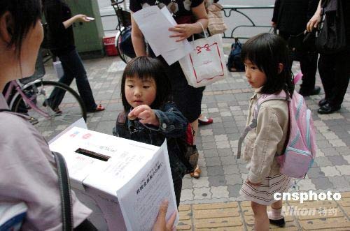 5月18日,一位日本小朋友為四川大地震災(zāi)區(qū)捐款。當(dāng)日,日本僑報(bào)社創(chuàng)辦的星期日漢語(yǔ)角舉行第40次交流會(huì),主題為“向四川震區(qū)人民獻(xiàn)愛(ài)心”募捐和義賣活動(dòng)。漢語(yǔ)角參加者來(lái)到繁華的池袋車站進(jìn)行街頭募捐,全力支援中國(guó)抗震救災(zāi)。中新社發(fā) 段躍中 攝