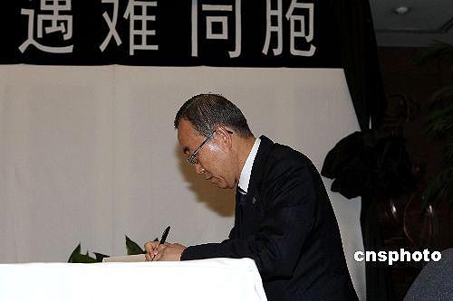 5月19日,聯(lián)合國(guó)秘書(shū)長(zhǎng)潘基文來(lái)到中國(guó)常駐聯(lián)合國(guó)代表團(tuán),向四川大地震遇難者表示哀悼。潘基文在吊唁簿上用中文寫(xiě)道:哀悼罹難的中國(guó)人民。中新社發(fā) 譚宏偉 攝