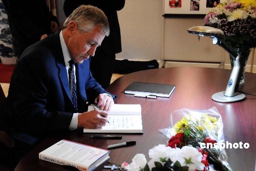 美國國會參院外交關系委員會成員、聯(lián)邦參議員恰克·黑格爾,當地時間五月十九日傍晚來到中國駐美國大使館悼念中國四川大地震遇難者。圖為黑格爾參議員在悼念紀念冊上留言:我為那些在四川大地震中遇難的中國人民感到悲痛,我堅信中國人民在政府的支持下能夠克服目前的困難。