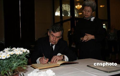 當(dāng)?shù)?月20日下午,英國首相布朗來到中國駐英大使館,吊唁四川大地震的遇難者。圖為布朗首相在吊唁簿上留言。中新社發(fā) 洪濤 攝