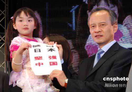 5月25日,中國(guó)駐日本大使崔天凱(右)出席在東京六本木舉行的四川大地震賑災(zāi)義演,與華人小女孩共舉“感謝日本,堅(jiān)強(qiáng)中國(guó)”標(biāo)語(yǔ)。中新社發(fā) 侯宇 攝