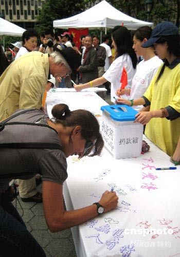 5月31日,由大紐約地區(qū)僑界、商界、學(xué)界共同發(fā)起的“手拉手,心連心,情系災(zāi)區(qū),賑災(zāi)助學(xué)”大型義演活動(dòng)在紐約曼哈頓舉行。本次活動(dòng)全部募捐所得款項(xiàng)都將轉(zhuǎn)交中國(guó)駐紐約總領(lǐng)事館,用于幫助四川災(zāi)區(qū)兒童盡快重返校園。圖為觀看義演活動(dòng)的外國(guó)友人捐款后在“災(zāi)無情、人有情”的橫幅上簽名,祝福中國(guó)災(zāi)區(qū)人民早日重建家園。中新社發(fā) 鄧悅 攝