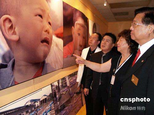 6月14日,“中國汶川大地震圖片巡回展”在美國洛杉磯舉行,共展出活靈活現(xiàn)四川受震悲慘鏡頭及災(zāi)民奮勇抗災(zāi)的難忘畫面共120多幅珍貴照片,圖片巡回展旨在“感動(dòng)美國,救援災(zāi)區(qū)”。圖右起蒙特利公園市議員劉達(dá)強(qiáng)、世界華人華僑總會副主席姜華等被一張“地震中的小男孩”照片所吸引。中新社發(fā) 盧威 攝