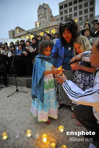 當(dāng)?shù)貢r(shí)間六月十四日晚,舊金山華人社團(tuán)在聯(lián)合廣場為汶川大地震遇難者舉行“五七”祭燭光追思會(huì)。不同族裔的人們也加入悼念的行列。兩位美國女童手捧蠟燭,寄托哀思。中新社發(fā) 陳鋼 攝