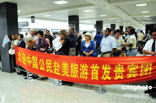 當(dāng)?shù)貢r(shí)間六月十七日晚,中國公民赴美旅游首發(fā)團(tuán)抵達(dá)華盛頓杜勒斯國際機(jī)場,美國商務(wù)部、機(jī)場所在地郡政府和當(dāng)?shù)芈糜紊缭跈C(jī)場等待迎接首發(fā)團(tuán)到來。該團(tuán)在華盛頓將破例受到美國商務(wù)部重視,將以有史以來最高接待規(guī)格接待中國旅游團(tuán),為他們安排高規(guī)格行程。古鐵雷斯部長將親自接待二百四十名中國游客。中新社發(fā) 邱江波 攝