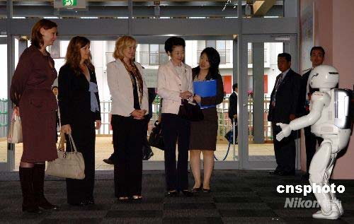 7月8日下午,在洞爺湖出席八國集團(tuán)峰會的部分國家元首夫人,在日本第一夫人貴代子的陪同下參觀峰會環(huán)保型的國際新聞中心。日本公司研制的機(jī)器人asimo在門口迎接諸位夫人的到來,并用流利的英語和夫人們進(jìn)行交流,令首腦夫人們驚喜不已。中新社發(fā) 朱沿華 攝