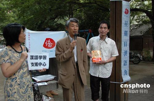 7月13日,在東京舉行的星期日漢語(yǔ)角第48次交流會(huì)上,日本僑報(bào)社宣布漢語(yǔ)學(xué)習(xí)支援中心正式成立。漢語(yǔ)學(xué)習(xí)支援中心的首個(gè)支援項(xiàng)目是,面向研究者的中文讀解力養(yǎng)成講座9月開講,由日本麗澤大學(xué)中文系三瀦正道教授擔(dān)綱,每周一下午5點(diǎn)至7點(diǎn)免費(fèi)為各大學(xué)的研究生和年輕學(xué)者、漢語(yǔ)學(xué)習(xí)者提供權(quán)威服務(wù)。圖為三瀦正道教授(中)向漢語(yǔ)角參加者介紹漢語(yǔ)學(xué)習(xí)支援中心。中新社發(fā) 段躍中 攝