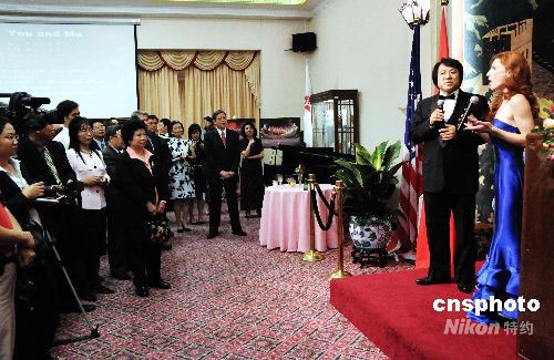 當(dāng)?shù)貢r(shí)間九月九日,在中國駐美大使館舉行的奧運(yùn)成功答謝招待會(huì)上,北京奧運(yùn)開幕主題歌《我和你》再度激蕩中美各界朋友的內(nèi)心。圖為來自華盛頓著名專業(yè)合唱團(tuán)職業(yè)歌唱家用意大利美聲唱法為招待會(huì)四百余名嘉賓演唱了這首歌曲,贏得了熱烈掌聲和贊揚(yáng)。中新社發(fā) 邱江波 攝