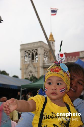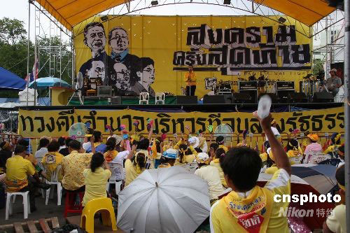 盡管泰國憲法法院九月九日已經(jīng)判決總理沙瑪因主持電視節(jié)目違背憲法無資格當總理,但占據(jù)總理府的民盟示威者依然沒有離去。中新社發(fā) 顧時宏 攝