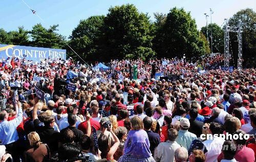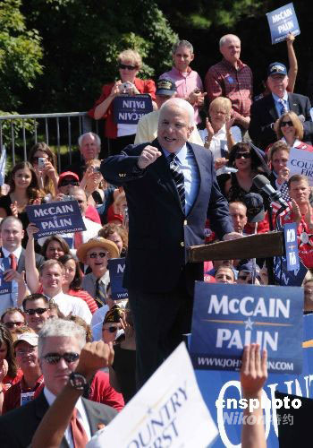 美國共和黨總統(tǒng)、副總統(tǒng)候選人約翰·麥凱恩和薩拉·佩林10日現(xiàn)身大華盛頓地區(qū)的弗吉尼亞州菲爾法克斯郡為競選造勢,支持者高呼“麥凱恩--合眾國”的口號,手舉麥凱恩、佩林的標語牌。中新社發(fā) 邱江波 攝