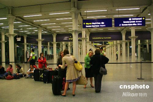 圖為11日晚間,倫敦圣潘克斯火車站取消了前往巴黎和布魯塞爾的列車,現(xiàn)場滯留的乘客被迫排隊等候訂酒店。