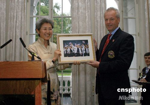 當(dāng)?shù)貢r(shí)間17日晚,中國駐英使館在倫敦文華東方酒店舉辦招待會(huì),慶祝北京奧運(yùn)會(huì)和殘奧會(huì)的閉幕。圖為中國駐英大使傅瑩(左)向英國奧委會(huì)首席執(zhí)行官西蒙·克萊格贈(zèng)送英國隊(duì)進(jìn)入鳥巢體育場時(shí)的照片。 中新社發(fā) 李鵬 攝