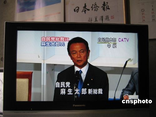 9月22日下午,日本自民黨在東京舉行總裁選舉投票,麻生太郎以351票高票當(dāng)選第23代日本自民黨總裁。圖為當(dāng)選新總裁的麻生太郎致詞。其他四位候選人與謝野馨以66票位居第二,小池百合子、石原伸晃和石破茂票數(shù)分列后三位。中新社發(fā) 段躍中 攝