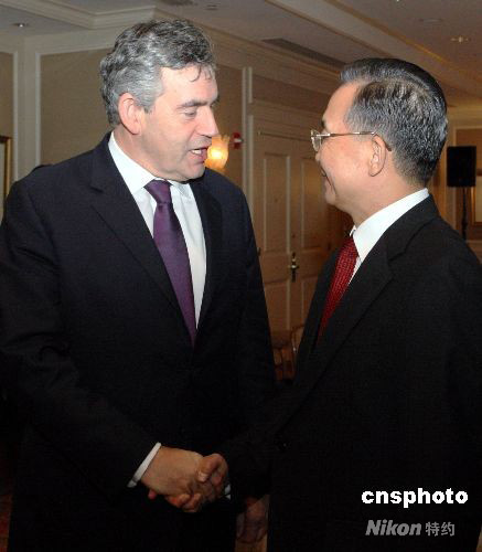 9月24日晚,中國總理溫家寶在紐約會見英國首相布朗。中新社發(fā) 李靜 攝