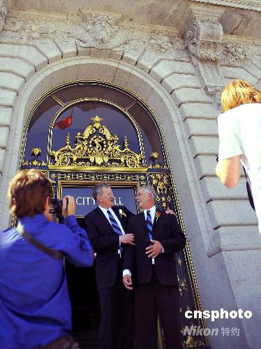 九月二十九日是美國(guó)舊金山同性戀伴侶麥卡弗和德斯勒相愛(ài)三十年的日子。三十年前的今天,他們?cè)谙愀鄱让墼隆H旰笏麄冊(cè)谂f金山市政府領(lǐng)取了結(jié)婚證書(shū)。加州最高法院裁定二00八年六月十六日是同性戀婚姻合法化的日子,但加州選民將在十一月再次對(duì)同性戀婚姻進(jìn)行投票表決。中新社發(fā) 陳鋼 攝
