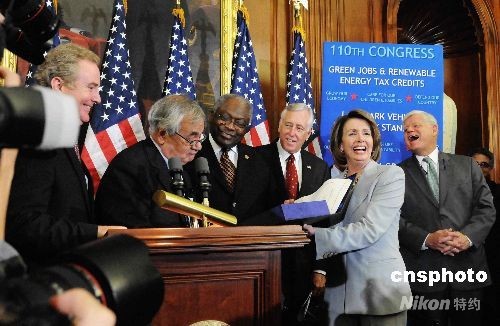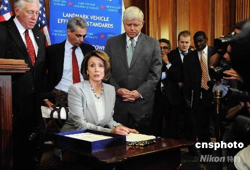 圖為眾議長(zhǎng)南希·佩洛西(坐者)在國(guó)會(huì)其他領(lǐng)袖的陪同下簽署了這個(gè)剛剛通過的方案。