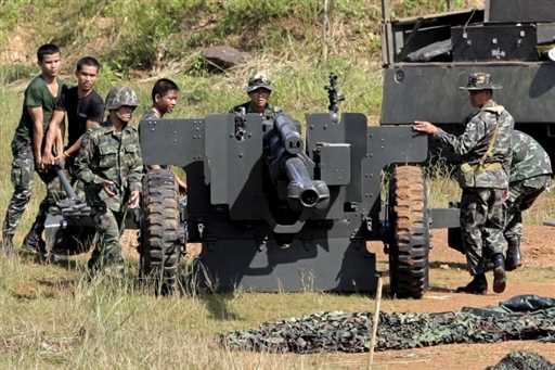 圖為10月15日,泰國軍人正在泰柬邊境架設高射炮。