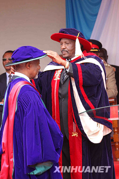 10月17日,在肯尼亞首都內(nèi)羅畢,內(nèi)羅畢大學(xué)校長(zhǎng)約瑟夫·旺朱伊(右)為聯(lián)合國(guó)前秘書(shū)長(zhǎng)科菲·安南(左)戴上博士帽。新華社發(fā)(湯姆·尼亞莫基攝)