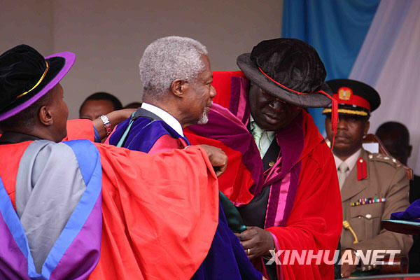 10月17日,在肯尼亞首都內(nèi)羅畢,內(nèi)羅畢大學(xué)副校長(zhǎng)喬治·馬果哈(左三)為聯(lián)合國(guó)前秘書(shū)長(zhǎng)科菲·安南(左二)穿上博士服。新華社發(fā)(湯姆·尼亞莫基攝)