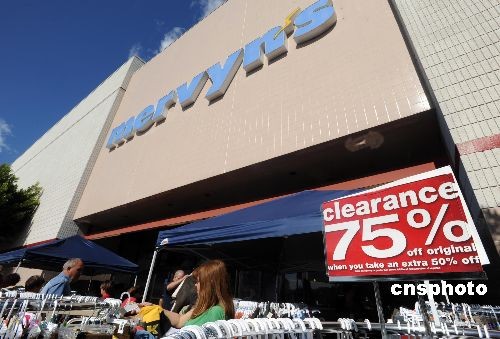 十月十八日,洛杉磯附近一家Mervyns百貨店打出削價(jià)百分之七十五清貨的告示,消費(fèi)者正在選購清貨甩賣的服裝。擁有五十九年歷史的美國老牌連鎖百貨公司Mervyns剛剛成為美國經(jīng)濟(jì)滑坡的新犧牲品。這家已經(jīng)申請破產(chǎn)保護(hù)的百貨公司周五宣布,旗下一百四十九家商店進(jìn)行清貨銷售,然后關(guān)門停業(yè)。美國金融危機(jī)已經(jīng)蔓延到實(shí)體經(jīng)濟(jì),十月份美國消費(fèi)信心指數(shù)創(chuàng)下三十年來最大月度跌幅。中新社發(fā) 張煒 攝