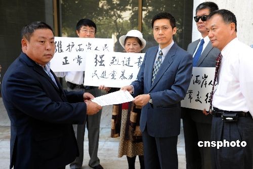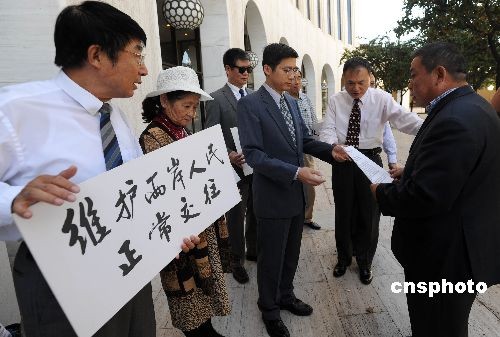 當(dāng)?shù)貢r(shí)間十月二十二日,南加州中國(guó)和平統(tǒng)一促進(jìn)會(huì)聯(lián)盟主席周德昭將一封抗議信交付“駐洛杉磯臺(tái)北經(jīng)濟(jì)文化辦事處”代表?xiàng)罟獗。這份由當(dāng)?shù)囟鄠(gè)華人社團(tuán)聯(lián)名的抗議信稱,大陸海協(xié)會(huì)副會(huì)長(zhǎng)張銘清在臺(tái)南遭民進(jìn)黨極端分子暴力攻擊事件震驚海外華人社會(huì),華人社團(tuán)嚴(yán)厲譴責(zé)極端分子的野蠻暴力行徑,強(qiáng)烈要求馬英九政府嚴(yán)懲肇事者。中新社發(fā) 張煒 攝