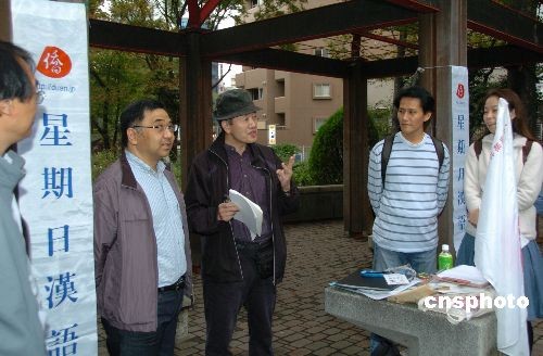 10月26日,由日本僑報社創(chuàng)辦的星期日漢語角在東京西池袋公園舉行第63次交流會。正在上海同濟大學留學的日本人高倉宏充,利用臨時回國的機會,詳細報告了他9月開始留學上海的情況,受到漢語角參加者的好評,不少人表示一定要去上?纯。高倉宏充還介紹了參加上海日語角和英語角的體會,引起大家的強烈興趣。圖為高倉宏充(中)在漢語角報告。中新社發(fā) 段躍中 攝