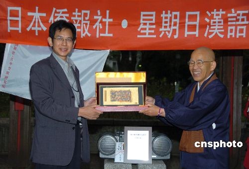 11月9日,日本僑報(bào)社創(chuàng)辦的星期日漢語角在東京西池袋公園舉行第65次交流會。會上舉行了第2屆小島康譽(yù)國際貢獻(xiàn)獎(jiǎng)?lì)C獎(jiǎng)儀式。著名日中友好人士小島康譽(yù)向?yàn)榇龠M(jìn)日中民間交流作出貢獻(xiàn)的《日本僑報(bào)》總編輯、漢語角創(chuàng)辦人段躍中頒發(fā)了一幅以中國新疆尼雅遺址出土的東漢“五星出東方利中國”古錦為原型的金箔藝術(shù)品和100萬日元。中國駐日使館友好交流參贊孫美嬌和中日兩國媒體、經(jīng)濟(jì)界、友好團(tuán)體及旅日留學(xué)生代表等約80人出席了當(dāng)天的頒獎(jiǎng)儀式。中新社發(fā) 日本僑報(bào)社 攝