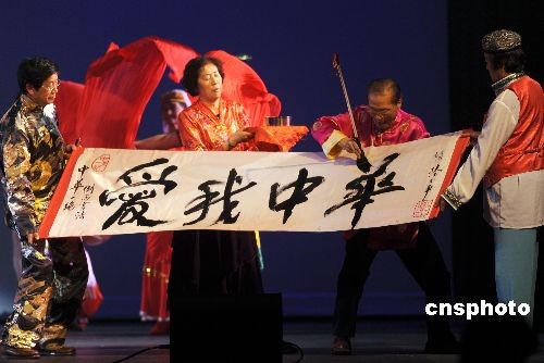 當(dāng)?shù)貢r間11月14日晚,由南加州華人聯(lián)合總會等主辦的2008洛杉磯中華藝術(shù)節(jié)拉開帷幕。中國僑聯(lián)“親情中華”藝術(shù)團(tuán)與洛杉磯華人藝術(shù)團(tuán)體共同為觀眾奉獻(xiàn)了一臺“親情中華”大型歌舞晚會。中新社發(fā) 張煒 攝