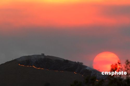 圖為太陽(yáng)下山時(shí)科洛娜市的山火仍在蔓延。中新社發(fā) 張煒 攝