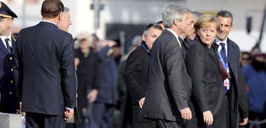 貝盧斯科尼撇開(kāi)歡迎委員會(huì)的工作人員,藏在一個(gè)街燈柱后面。當(dāng)?shù)聡?guó)總理默克爾走下專(zhuān)車(chē),要進(jìn)入他們會(huì)面的地區(qū)委員會(huì)總部時(shí),他突然從街燈柱后面跳出來(lái),嘴里還喊著“咕咕”。據(jù)說(shuō)默克爾看起來(lái)很開(kāi)心,與貝盧斯科尼擁抱,并且親切地稱(chēng)其“西爾維奧” 。
