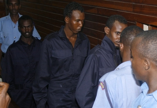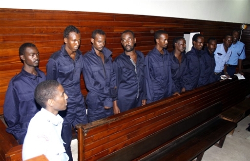 肯尼亞法庭19日對(duì)8名索馬里海盜(深色衣服)進(jìn)行傳訊,這些海盜被控在上周劫持英國(guó)船只。