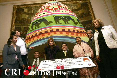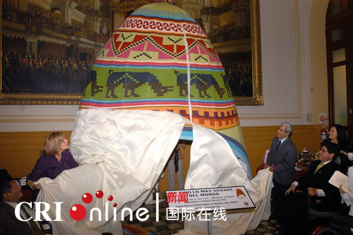 這頂帽子高6.5米,直徑3米,由秘魯國家殘疾人手工藝者聯(lián)合會的15名藝人用30種不同顏色線,花費18天時間制作完成。整個作品全部由秘魯特有動物羊駝的絨毛制成。上月底,這頂巨帽曾在秘魯國會首次展出,并已經(jīng)被載入吉尼斯世界紀(jì)錄。