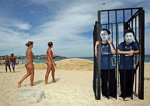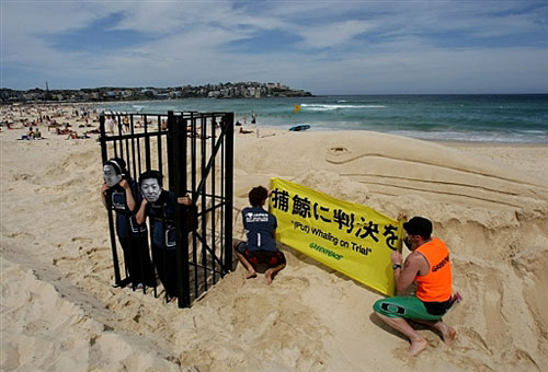 12月9日在悉尼邦迪海灘上,“綠色和平”組織成員站在一個(gè)籠子中,裝扮成日本兩位捕鯨抗議者Junichi Sato和Toru Suzuki,映射這兩位抗議者揭露日本非法捕鯨卻將被送進(jìn)監(jiān)獄的情況。在他們身后有一個(gè)17米長(zhǎng)的沙雕長(zhǎng)須鯨。