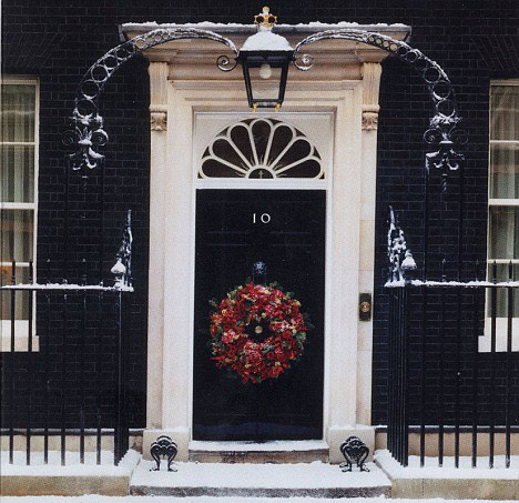唐寧街10號的漂亮前門、臺階以及欄桿上的灰塵非常干燥,表明那些雪花應(yīng)該是假的。
